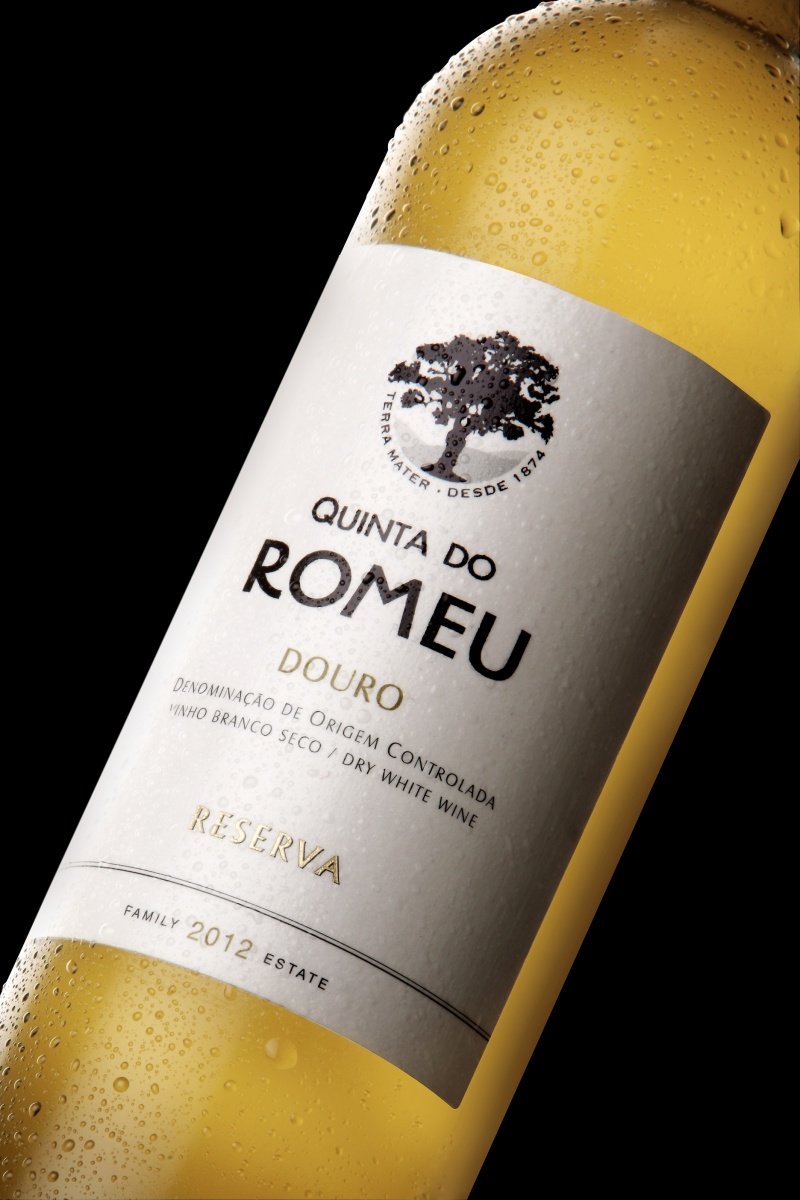 Garrafa de vinho branco Quinta do Romeu Douro com rótulo branco e cápsula dourada molhada
