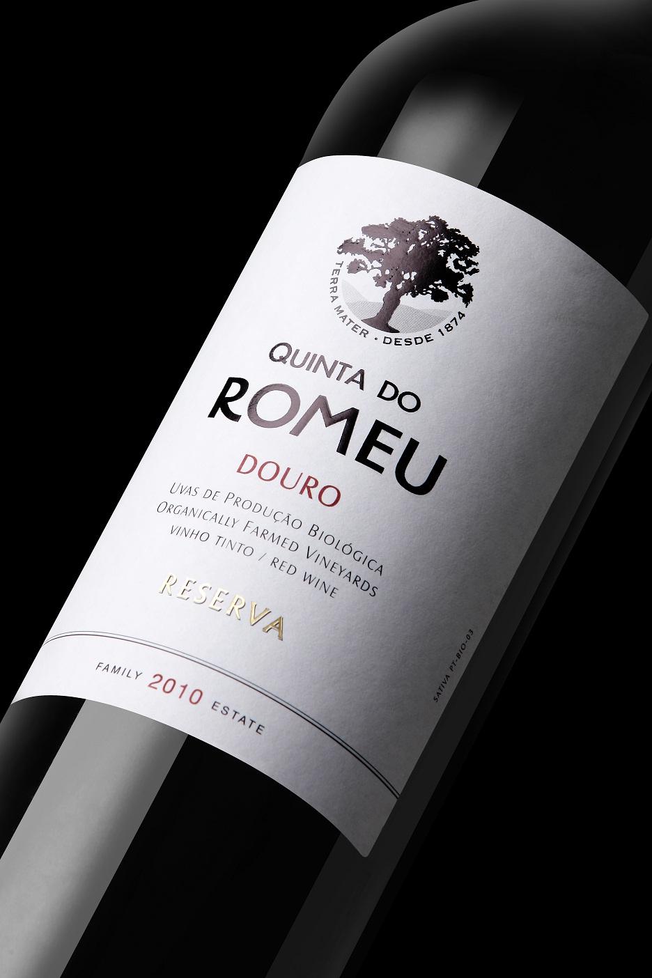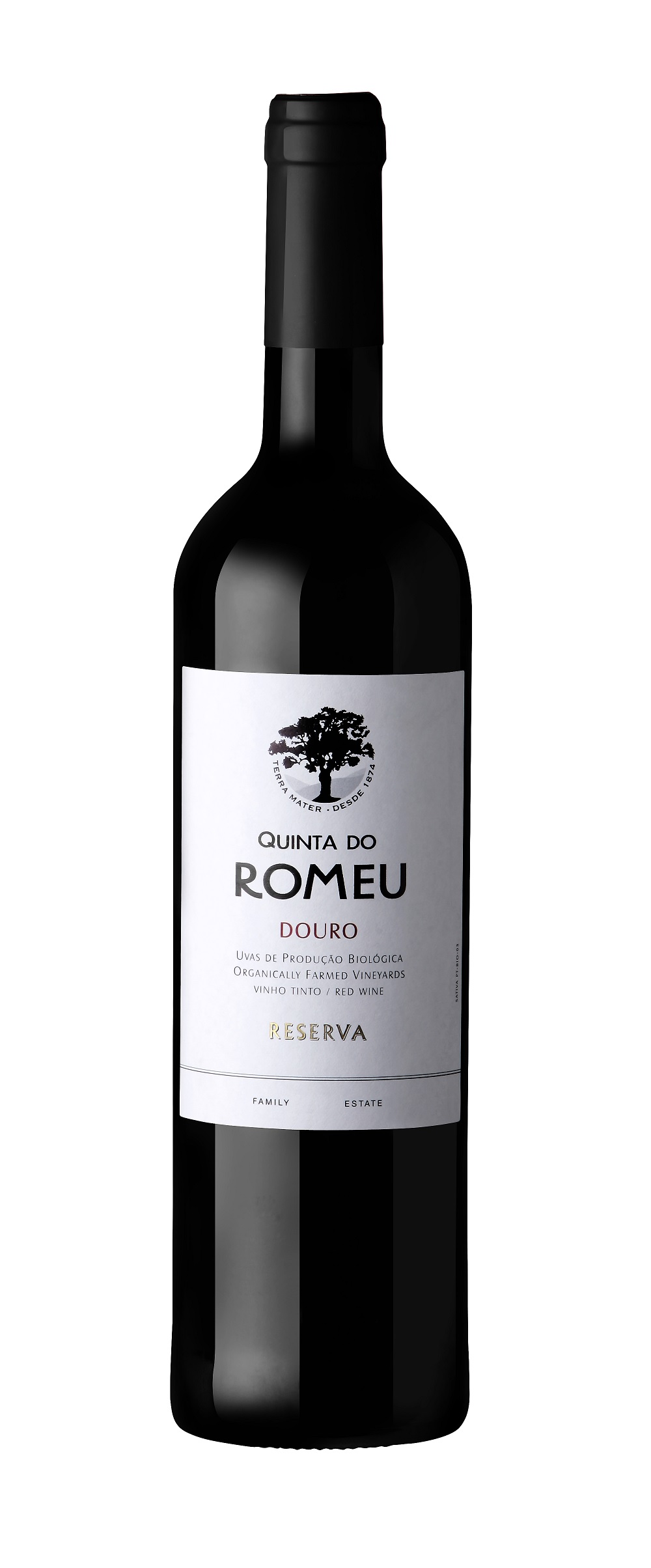Garrafa de vinho tinto Reserva Quinta do Romeu Douro com rótulo branco em vidro escuro